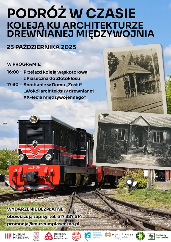 Zapraszamy Państwa dnia 23 października 2025 roku na wydarzenie „Podróż w czasie: koleją ku architekturze drewnianej międzywojnia”, które odbędzie się w Domu „Zośki” w Zalesiu Dolnym. Organizatorami spotkania są Muzeum Piaseczna, Piaseczyńsko‑Grójecka Kolej Wąskotorowa, Narodowy Instytut Dziedzictwa, Mazowiecki Urząd Ochrony Zabytków, Hufiec ZHP Piaseczno, Fundacja Dom „Zośki” oraz Obwód Piaseczno ZHR.